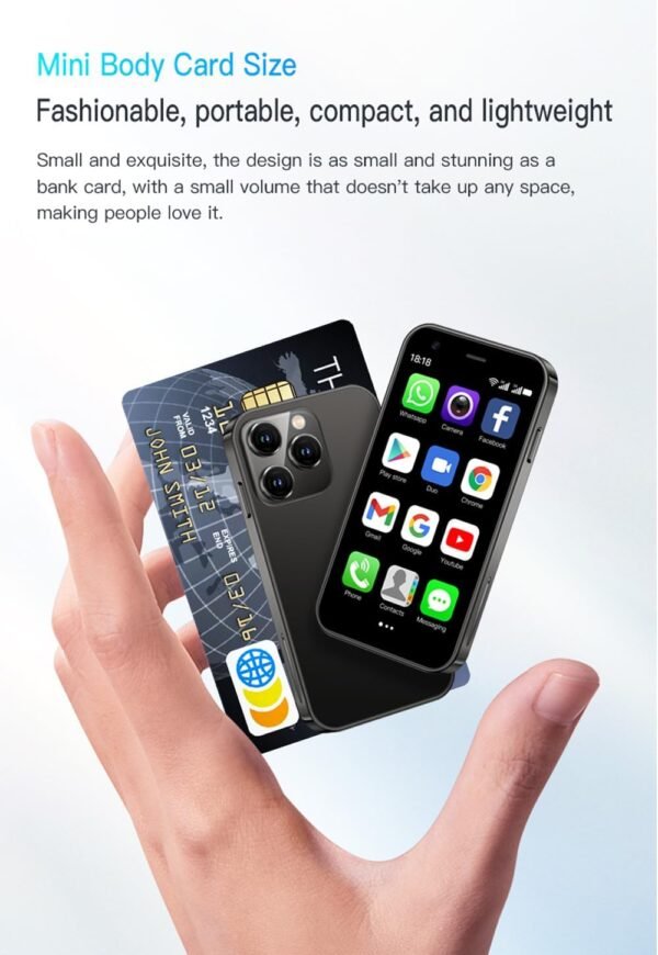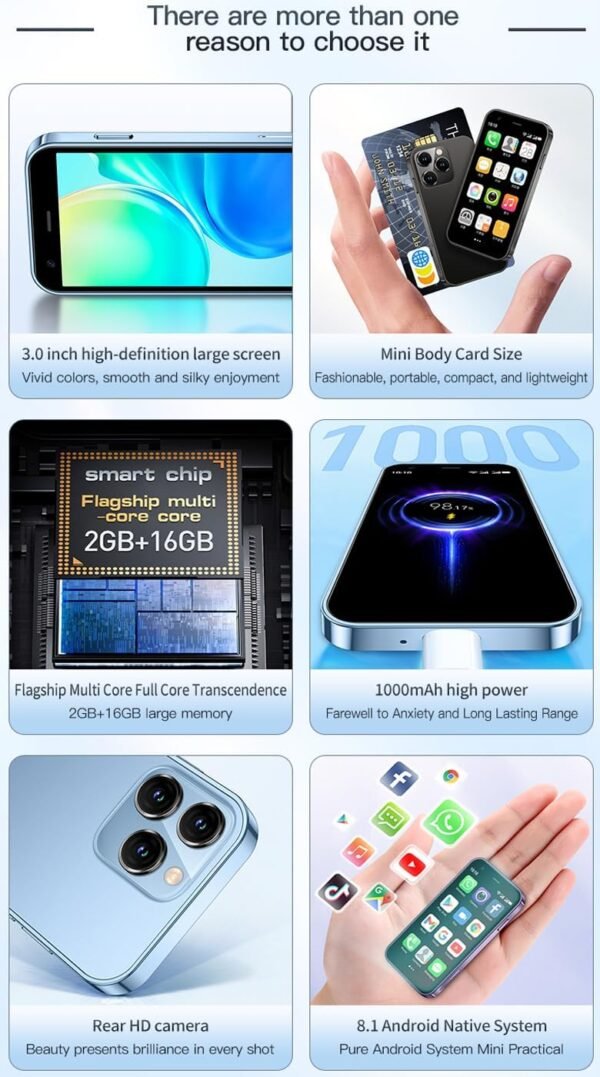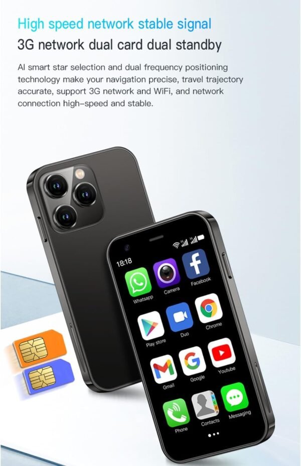 About this item Compact and Functional: This 3.0-inch Android 8.1 mini smartphone features a quad-core processor, 2GB RAM, and 16GB storage, supporting voice calls, video calls, apps, camera, and internet connectivity via 3G, Wi-Fi, and Bluetooth. Versatile Connectivity: Compatible with GSM (850/900/1800/1900 MHz) and WCDMA (B1/B2/B5/B8) networks, this dual-SIM phone supports various apps and offers features like GPS navigation, FM radio, and multiple language options. Portable Power: Equipped with a 1000mAh lithium-ion battery, this compact device provides up to 2-3 days of usage on a single charge, making it suitable for outdoor activities and travel.